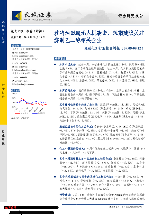 【长城证券】【20190916】20190916-长城证券-基础化工行业投资周报:沙特油田遭无人机袭击,短期建议关注煤制乙二醇相关企业-26页