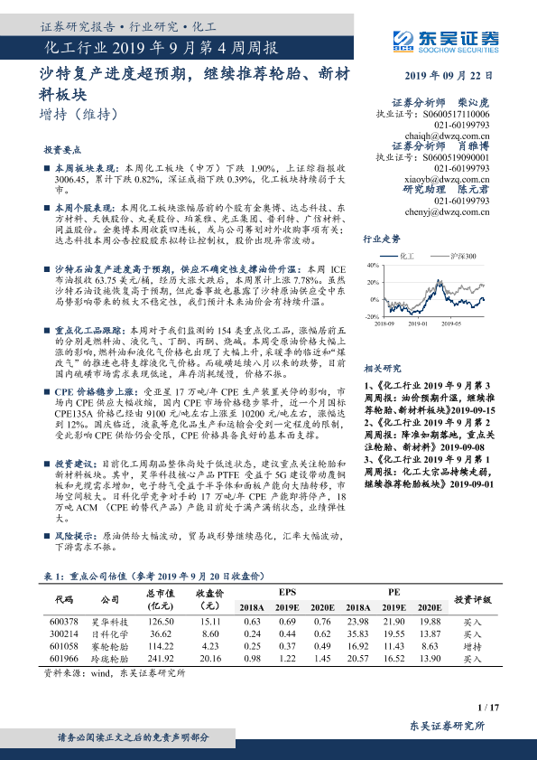 【东吴证券】【20190922】化工行业2019年9月第4周周报:沙特复产进度超预期,继续推荐轮胎、新材料板块-17页