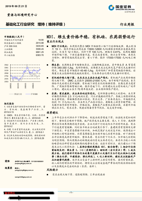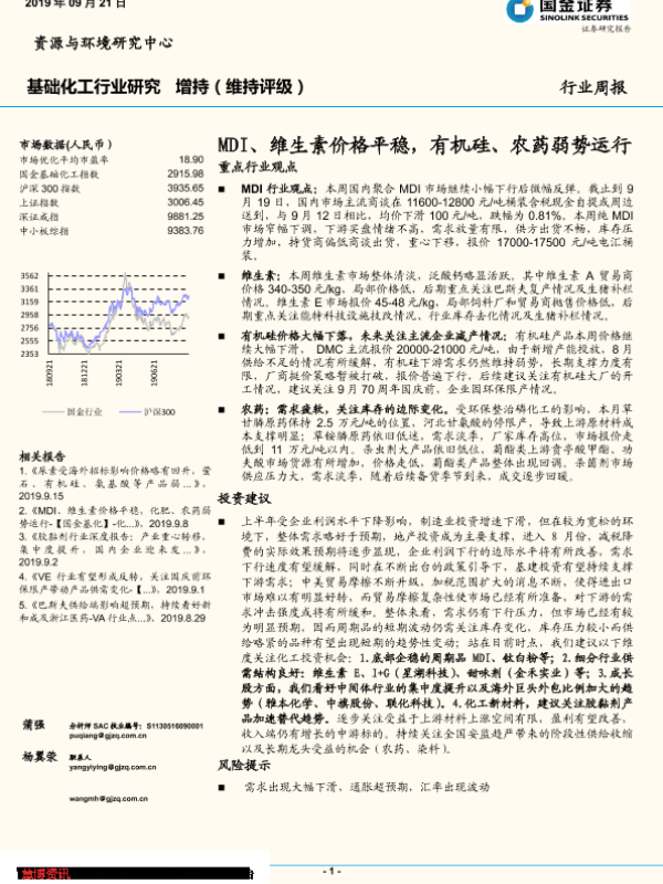 【国金证券】【20190921】基础化工行业研究周报:MDI、维生素价格平稳,有机硅、农药弱势运行-32页