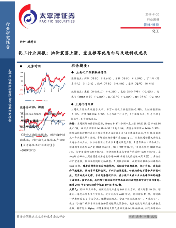 【太平洋证券】【20190920】20190920-太平洋-化工行业周报:油价震荡上涨,重点推荐优质白马及硬科技龙头-38页