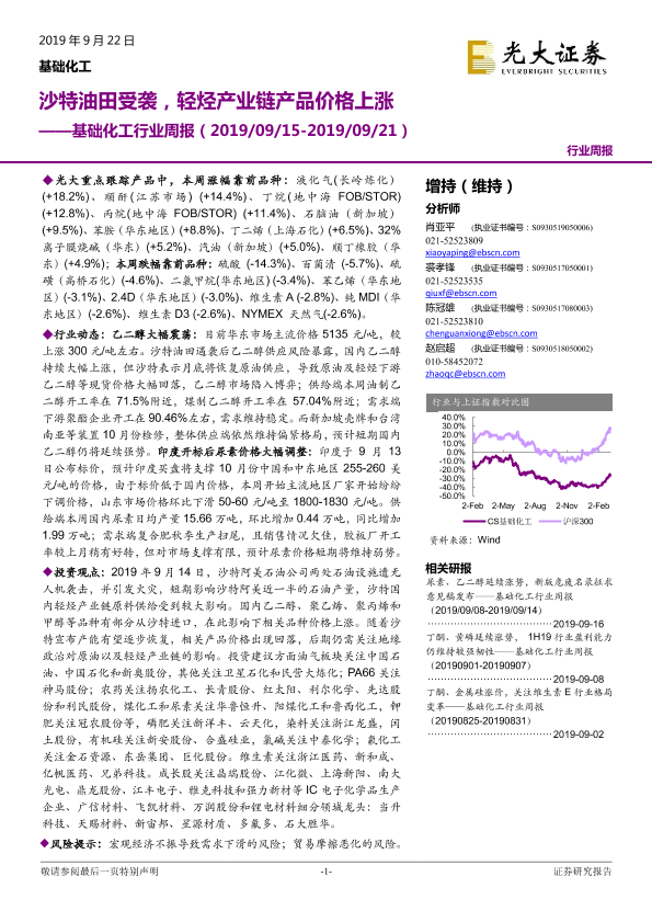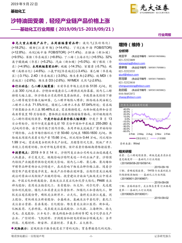【光大证券】【20190922】基础化工行业周报:沙特油田受袭,轻烃产业链产品价格上涨-19页