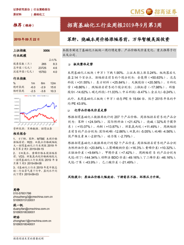 【海通证券】【20190922】招商基础化工行业周报2019年9月第3周:苯酐、烧碱本周价格涨幅居前,万华暂缓美国投资-19页