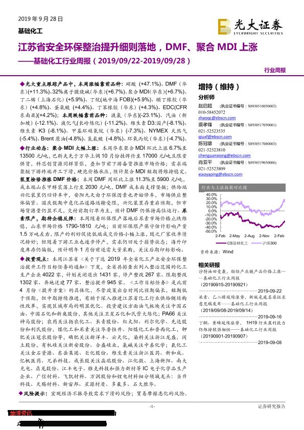 【光大证券】【20190928】20190928-光大证券-基础化工行业周报:江苏省安全环保整治提升细则落地,DMF、聚合MDI上涨-19页