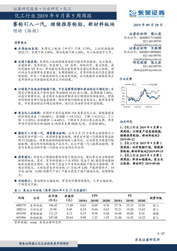 【东吴证券】【20190928】化工行业2019年9月第5周周报:赛轮引入一汽,继续推荐轮胎、新材料板块-17页