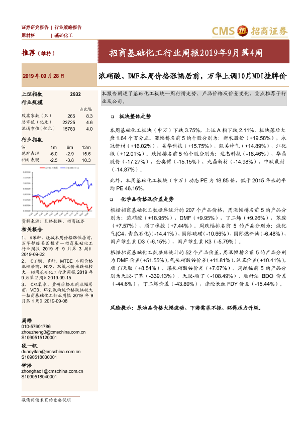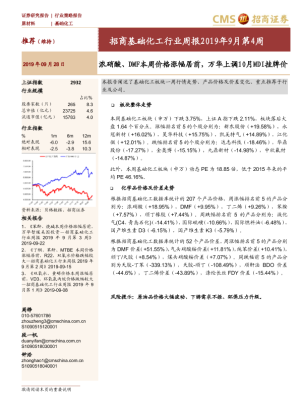 【海通证券】【20190928】招商基础化工行业周报2019年9月第4周:浓硝酸、DMF本周价格涨幅居前,万华上调10月MDI挂牌价-20页