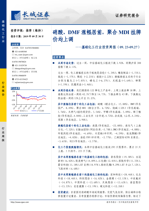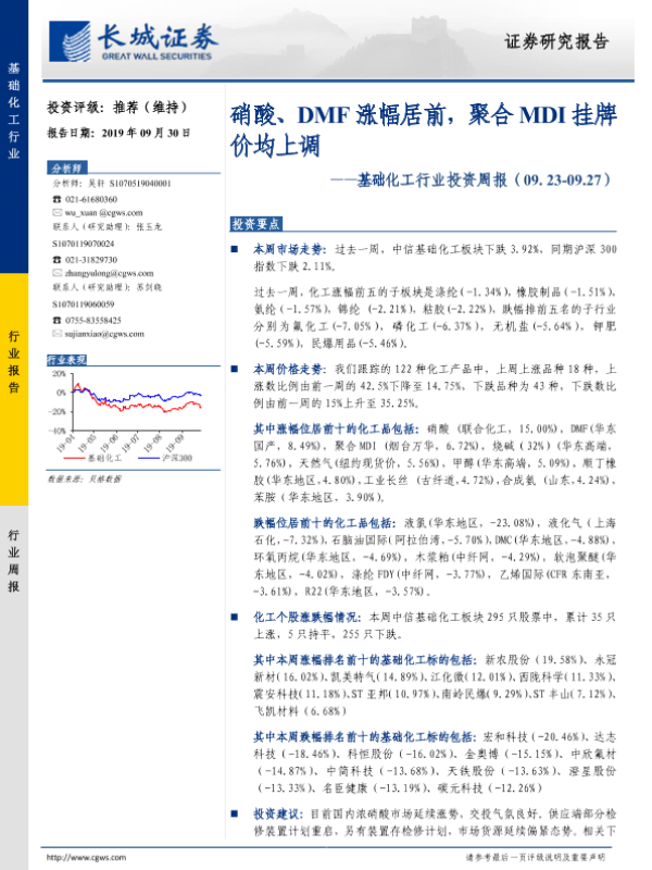 【长城证券】【20190930】基础化工行业投资周报:硝酸、DMF涨幅居前,聚合MDI挂牌价均上调-29页