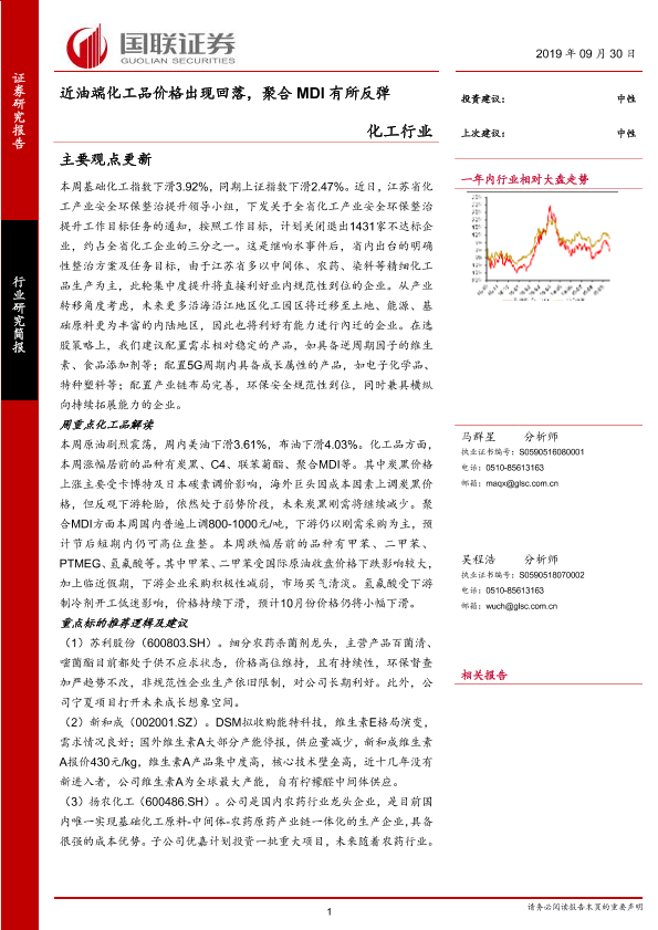 【国联证券】【20190930】20190930-国联证券-化工行业研究简报:近油端化工品价格出现回落,聚合MDI有所反弹-17页