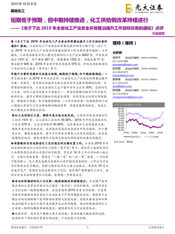 【光大证券】【20191008】《关于下达2019年全省化工产业安全环保整治提升工作目标任务的通知》点评:短期低于预期,但中期持续推进,化工供给侧改革持续进行-9页