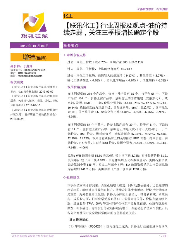 三季报预测 产品价格 化工行业 投资建议 油价波动