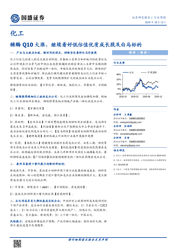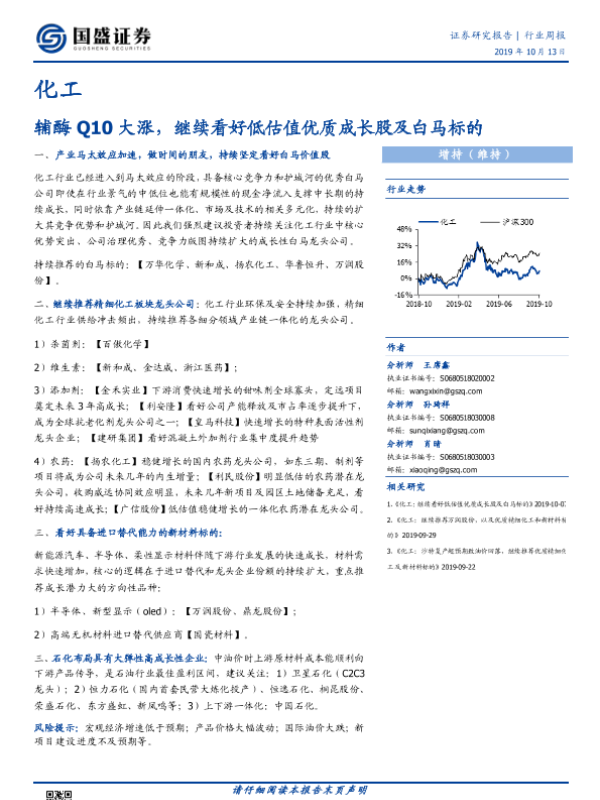 【国盛证券】【20191013】20191013-国盛证券-化工行业周报:辅酶Q10大涨,继续看好低估值优质成长股及白马标的-6页