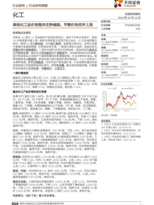 【天风证券】【20191013】20191013-天风证券-化工行业研究周报:基础化工品价格整体走势偏弱,甲醇价格有所上涨-16页