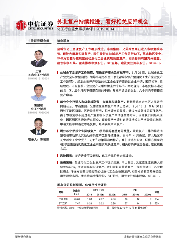 【中信证券】【20191014】化工行业重大事项点评:苏北复产持续推进,看好相关反弹机会-2页
