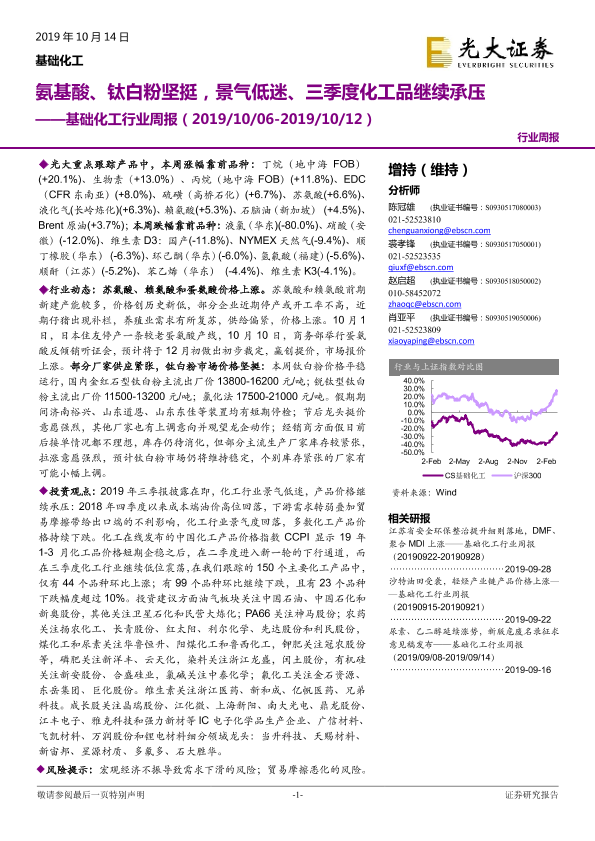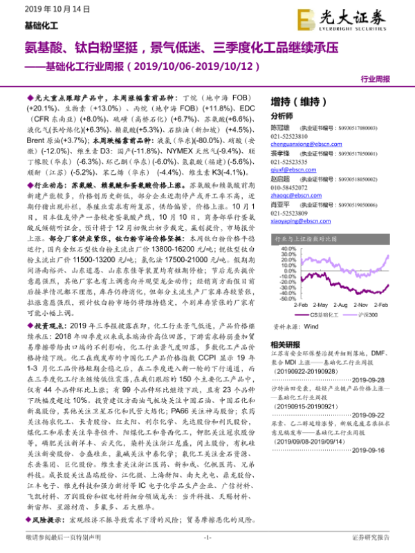 【光大证券】【20191014】20191014-光大证券-基础化工行业周报:氨基酸、钛白粉坚挺,景气低迷、三季度化工品继续承压-19页