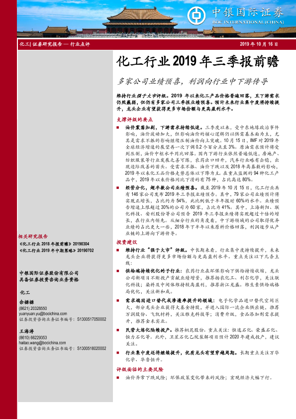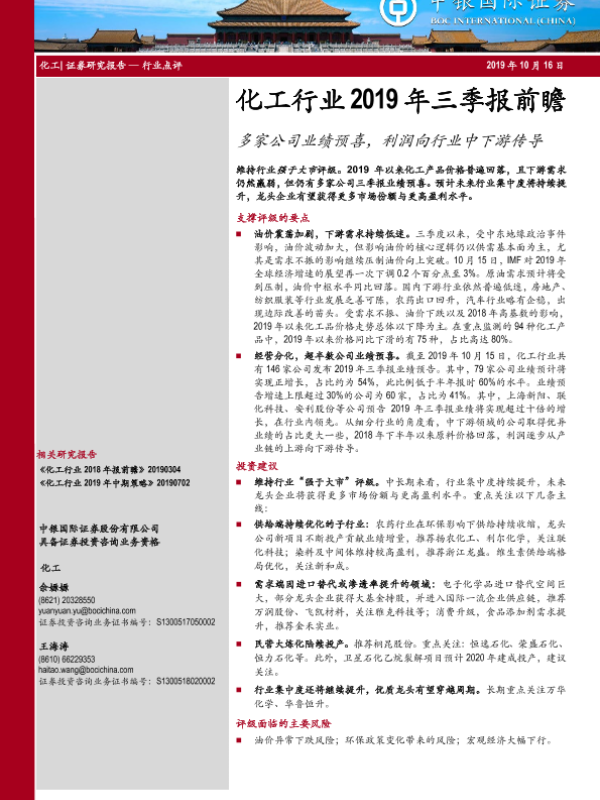 【中银证券】【20191016】化工行业2019年三季报前瞻:多家公司业绩预喜,利润向行业中下游传导-12页