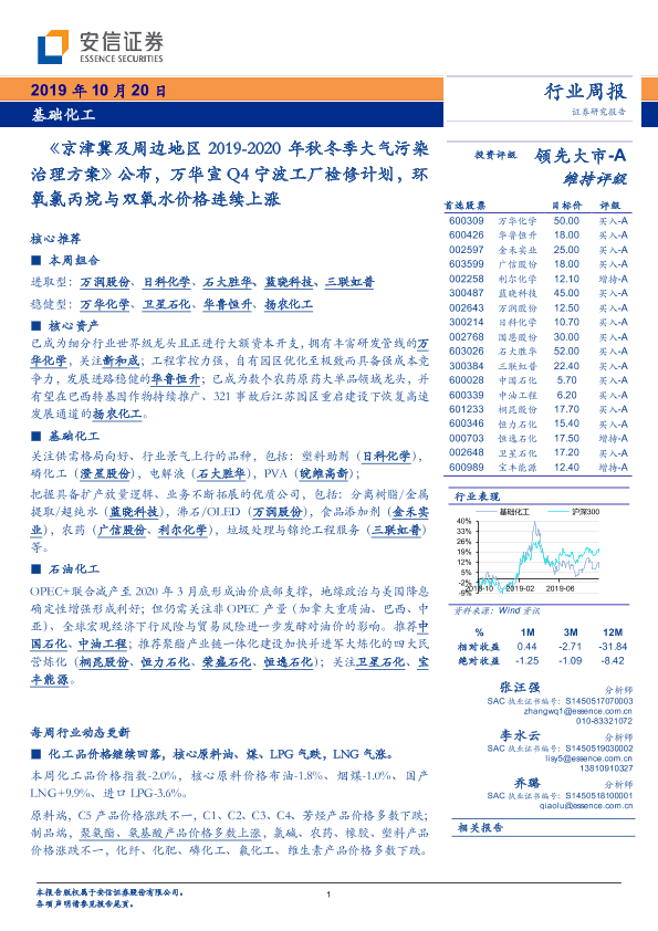 【安信证券】【20191020】信证券-基础化工行业周报:《京津冀及周边地区2019-2020年秋冬季大气污染治理方案》公布,万华宣Q4宁波工厂检修计划,环氧氯丙烷与双氧水价格连续上涨-8页