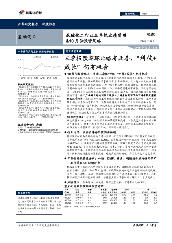 【国信证券】【20191015】基础化工行业三季报业绩前瞻&10月份投资策略:三季报预期环比略有改善,“科技+成长”仍有机会-25页