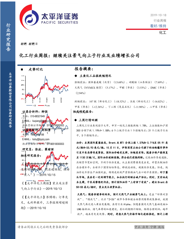 【太平洋证券】【20191018】化工行业周报:继续关注景气向上子行业及业绩增长公司-40页