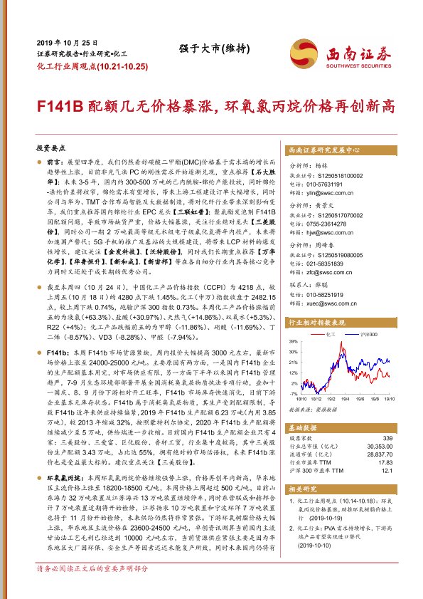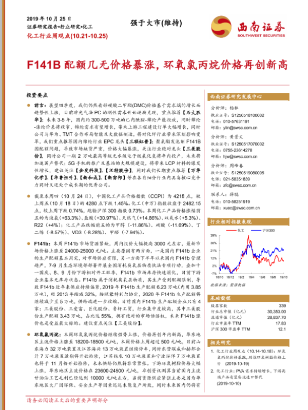【西南证券】【20191025】20191025-西南证券-化工行业周观点:F141B配额几无价格暴涨,环氧氯丙烷价格再创新高-9页