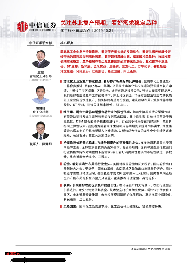 【中信证券】【20191021】20191021-中信证券-化工行业每周观点:关注苏北复产预期,看好需求稳定品种-27页