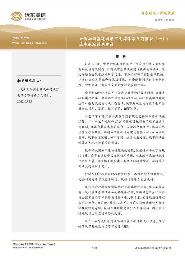 【远东资信】【20220622】全面加强基建与债市支撑体系系列报告(一):城市基础设施建设-20页