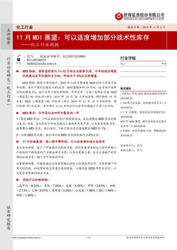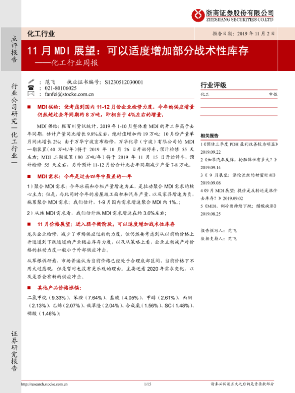 【浙商证券】【20191102】20191102-浙商证券-化工行业周报:11月MDI展望:可以适度增加部分战术性库存-15页