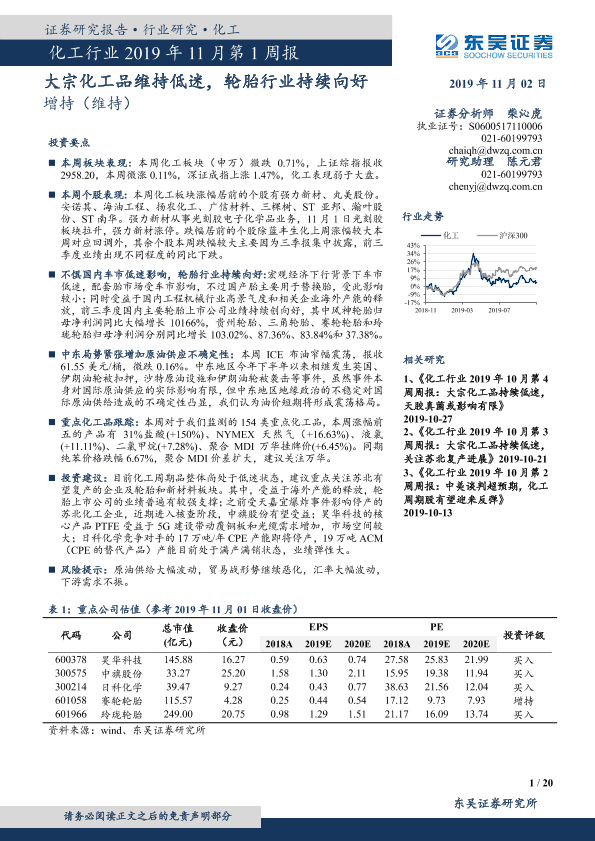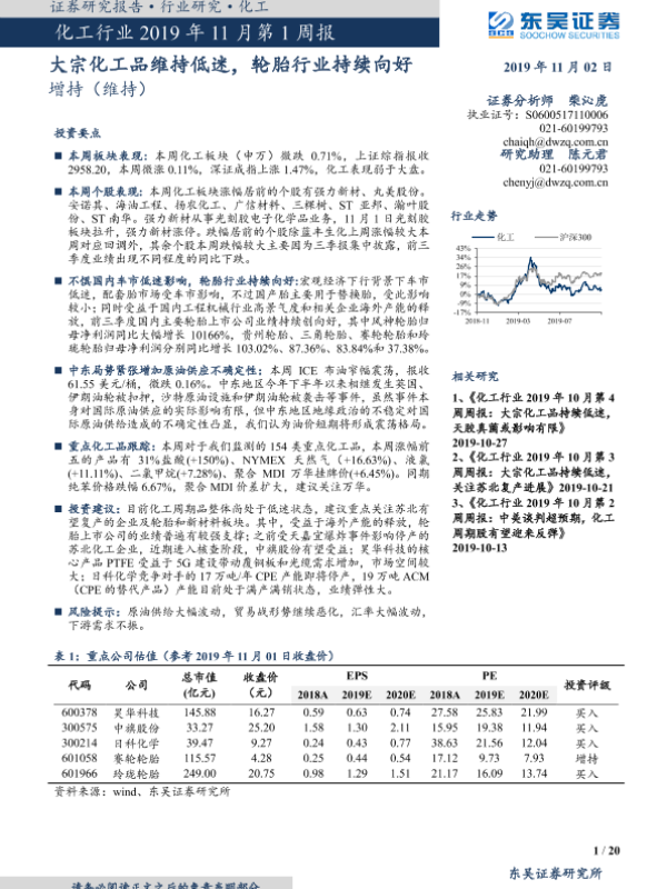 【东吴证券】【20191102】化工行业2019年11月第1周报:大宗化工品维持低迷,轮胎行业持续向好-20页