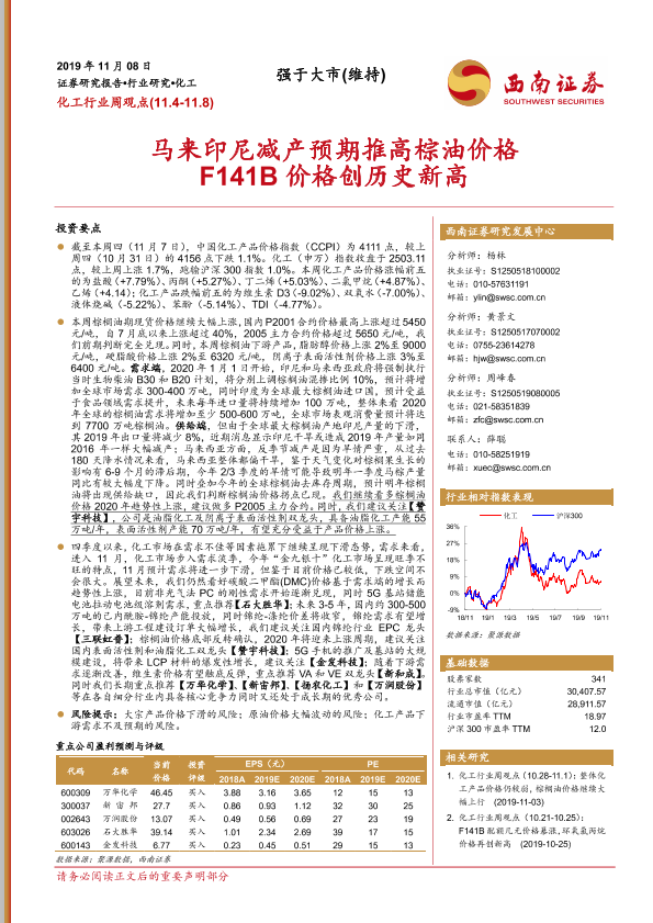 【西南证券】【20191108】20191108-西南证券-化工行业周观点:马来印尼减产预期推高棕油价格F141B价格创历史新高-7页