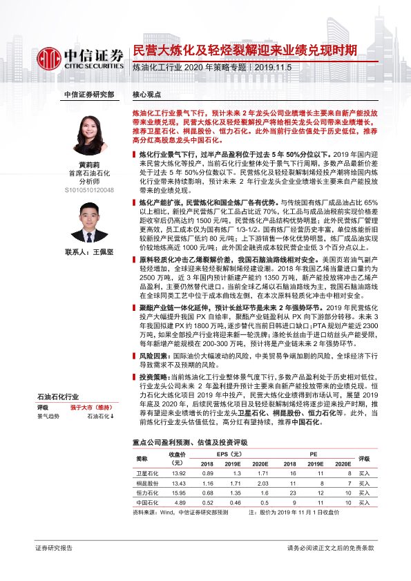 【中信证券】【20191105】炼油化工行业2020年策略专题:民营大炼化及轻烃裂解迎来业绩兑现时期-16页