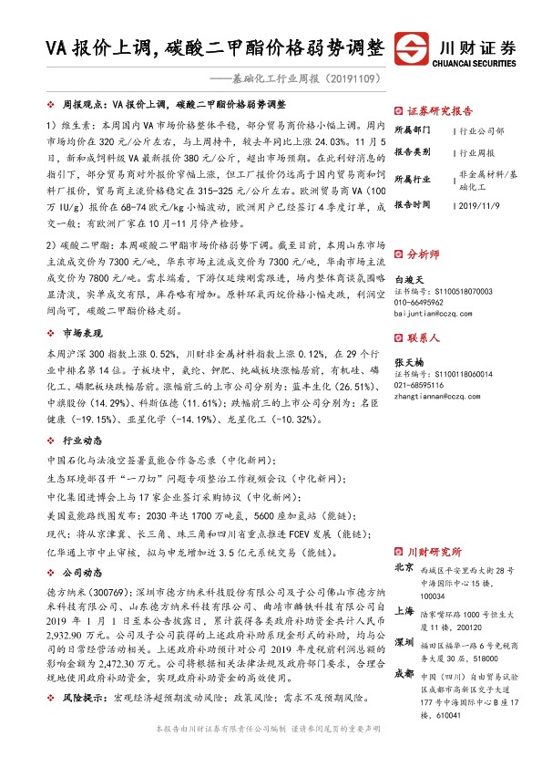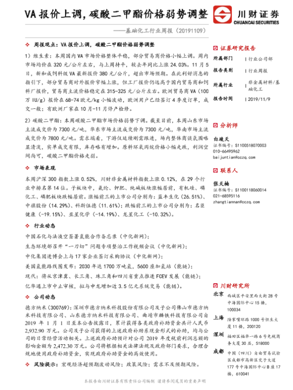 【川财证券】【20191109】20191109-川财证券-基础化工行业周报:VA报价上调,碳酸二甲酯价格弱势调整-21页