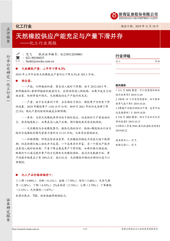 【浙商证券】【20191110】化工行业周报:天然橡胶供应产能充足与产量下滑并存-15页