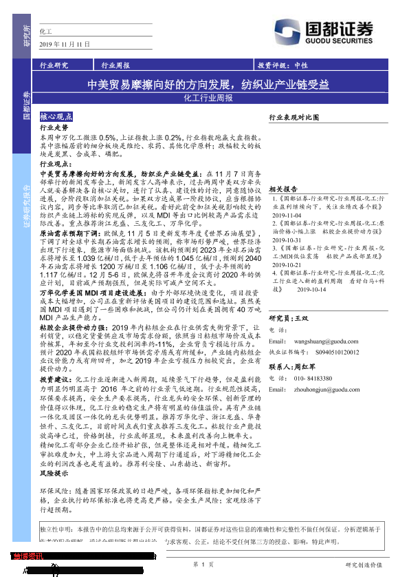 【国都证券】【20191111】20191111-国都证券-化工行业周报:中美贸易摩擦向好的方向发展,纺织业产业链受益-2页