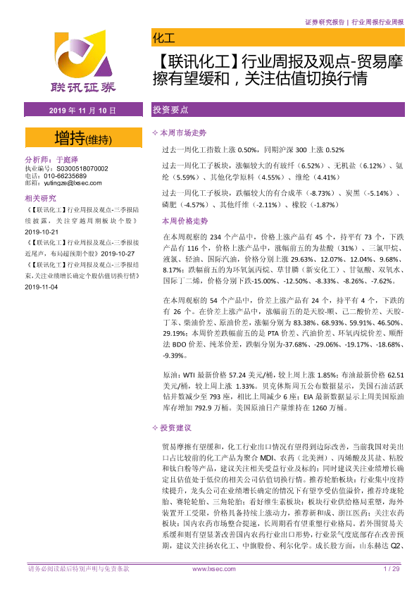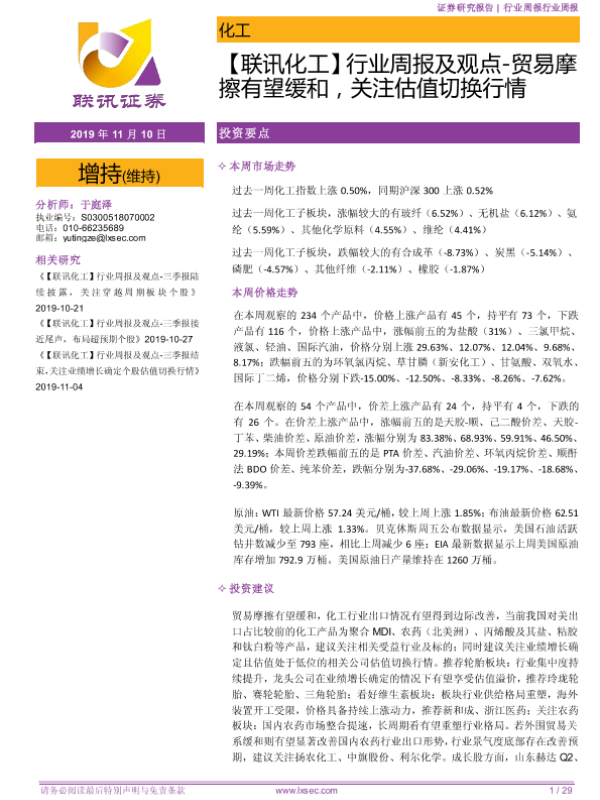 估值切换 化工行业 周报 投资建议 贸易摩擦