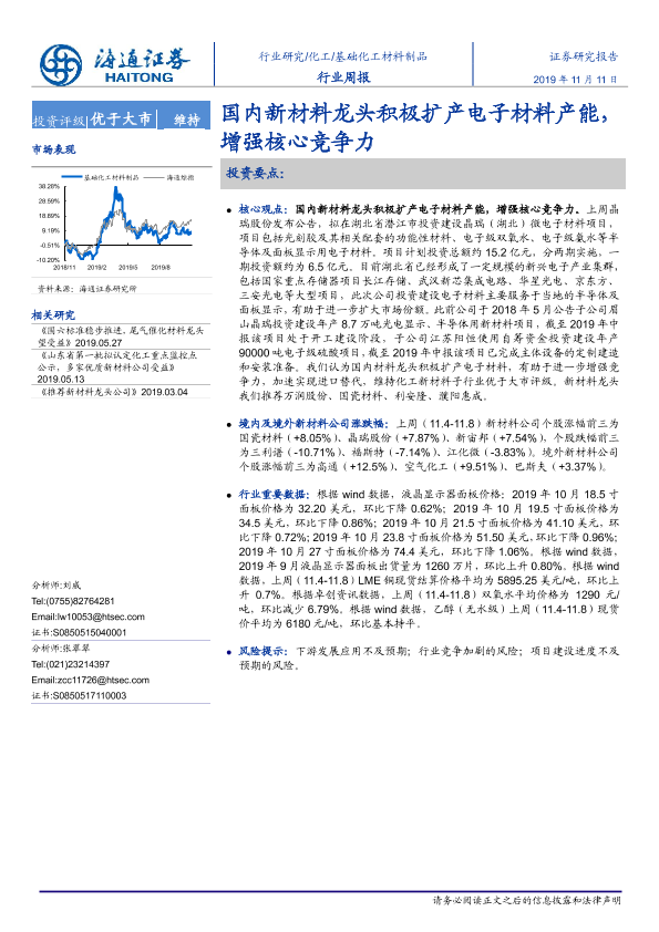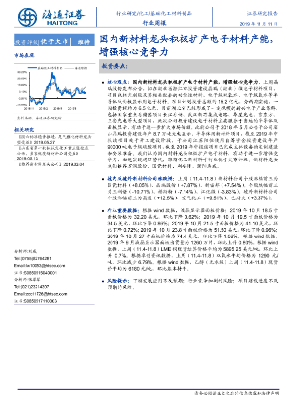 【海通证券】【20191111】基础化工材料制品行业周报:国内新材料龙头积极扩产电子材料产能,增强核心竞争力-8页