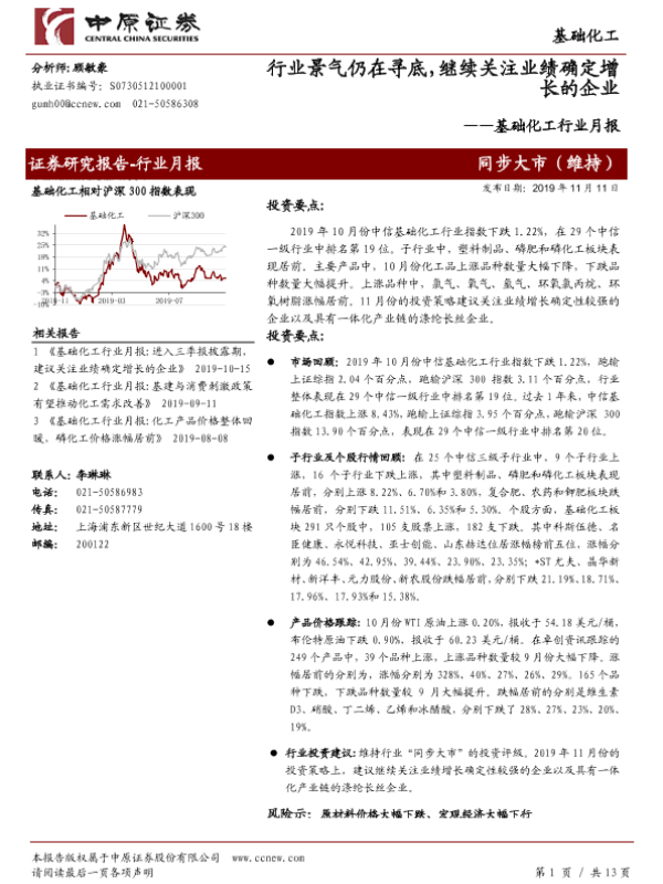 【中原证券】【20191111】基础化工行业月报:行业景气仍在寻底,继续关注业绩确定增长的企业-13页