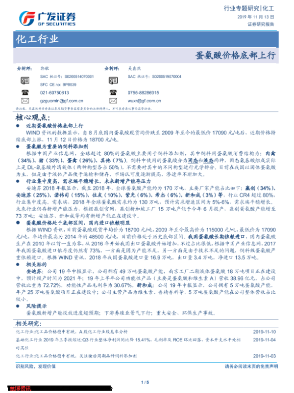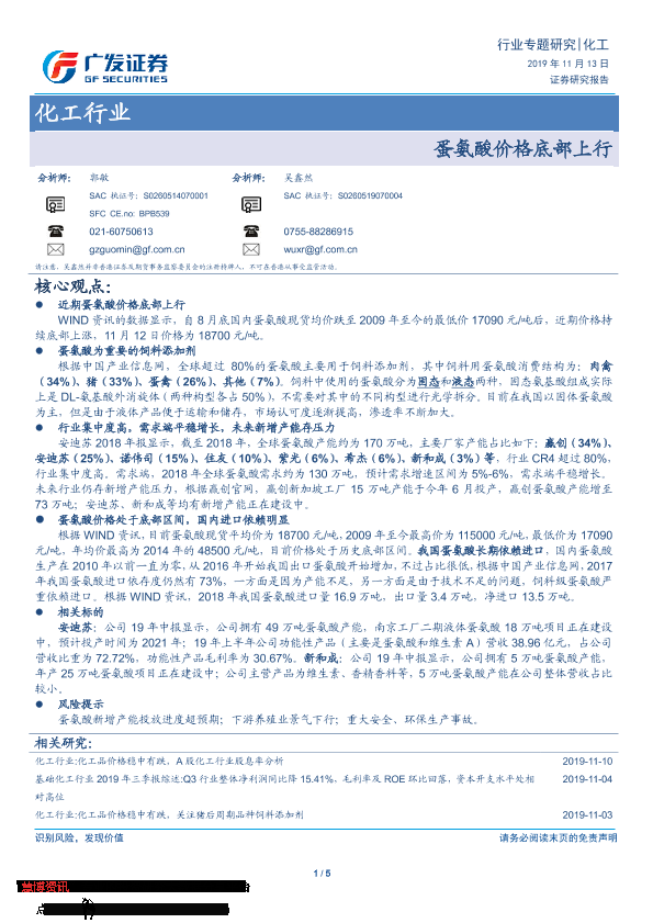 【广发证券】【20191113】化工行业专题研究:蛋氨酸价格底部上行-5页