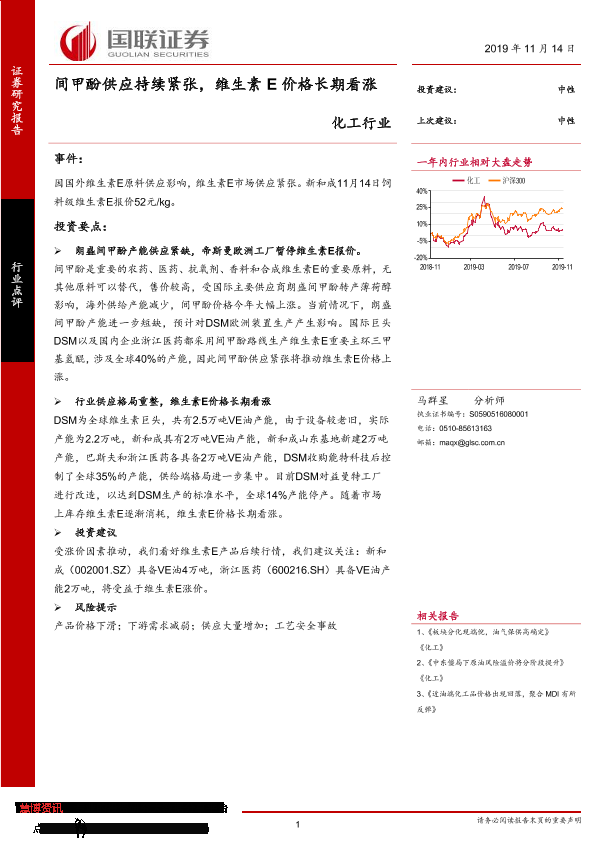 【国联证券】【20191114】化工行业:间甲酚供应持续紧张,维生素E价格长期看涨-3页