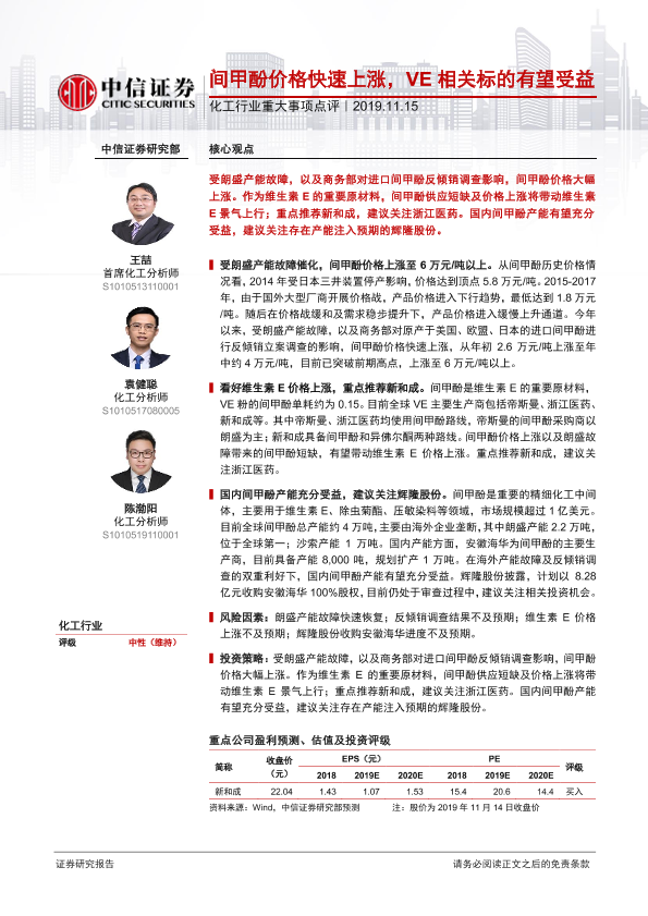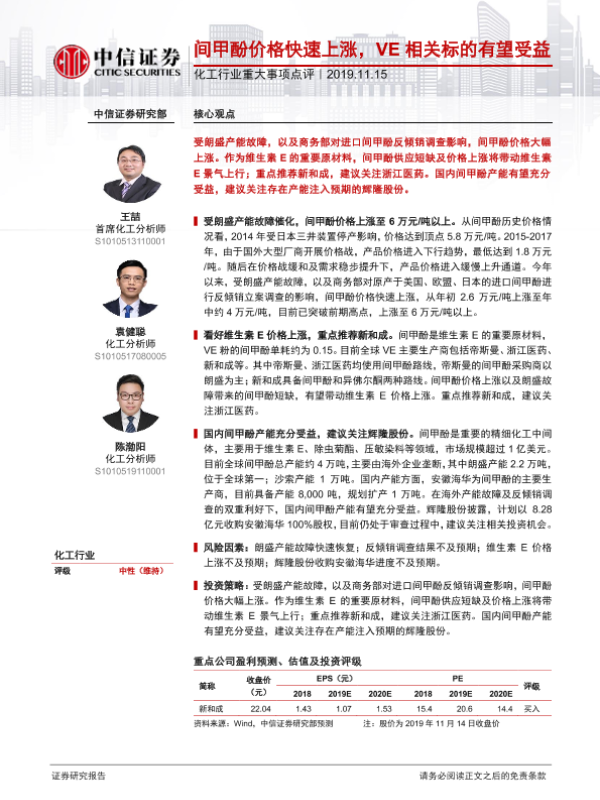 【中信证券】【20191115】化工行业重大事项点评:间甲酚价格快速上涨,VE相关标的有望受益-2页