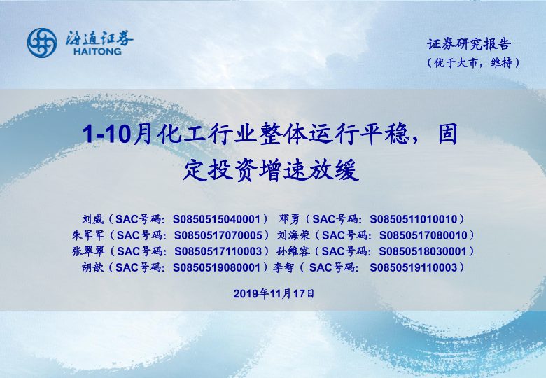 【海通证券】【20191117】1-10月化工行业整体运行平稳,固定投资增速放缓-16页