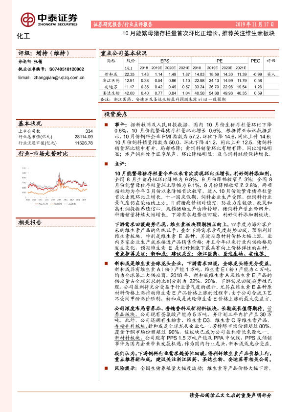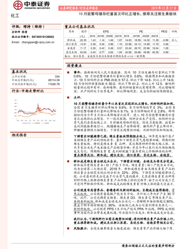 【中泰证券】【20191117】20191117-中泰证券-化工行业点评报告:10月能繁母猪存栏量首次环比正增长,推荐关注维生素板块-2页