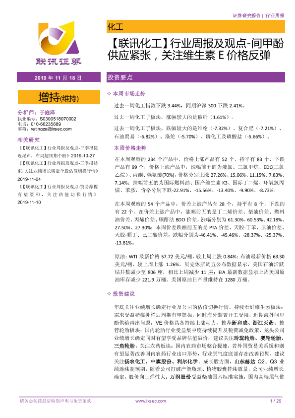 【粤开证券】【20191118】行业周报及观点-间甲酚供应紧张,关注维生素E价格反弹-29页