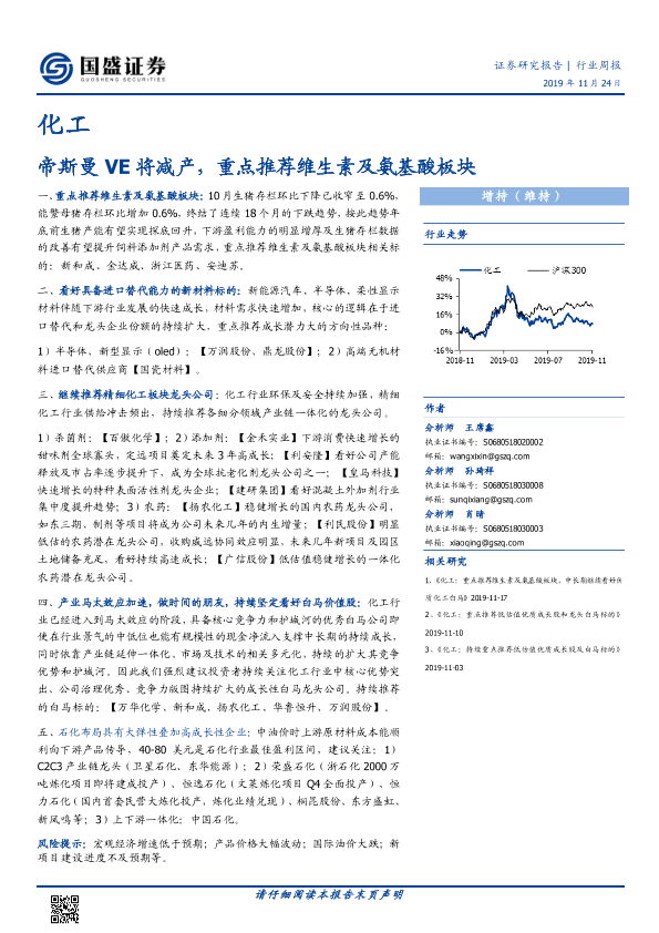 【国盛证券】【20191124】20191124-国盛证券-化工行业周报:帝斯曼VE将减产,重点推荐维生素及氨基酸板块-6页