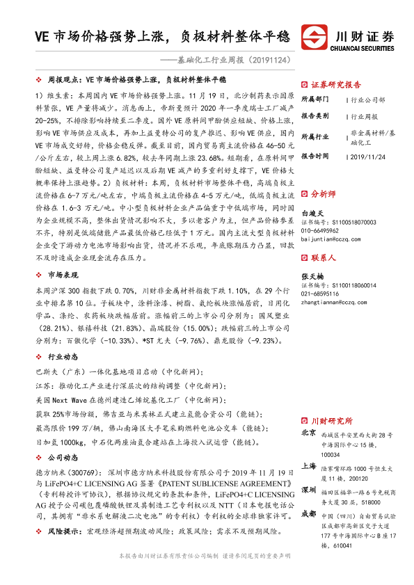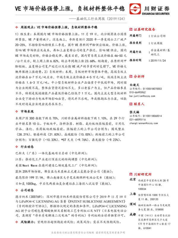 【川财证券】【20191124】基础化工行业周报:VE市场价格强势上涨,负极材料整体平稳-21页