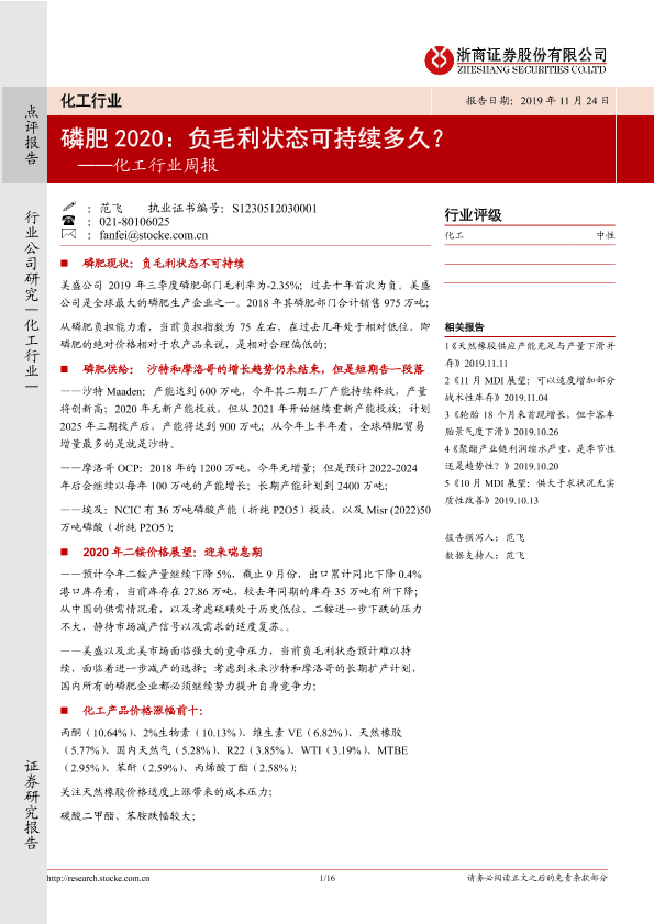 【浙商证券】【20191124】化工行业周报:磷肥2020:负毛利状态可持续多久?-16页