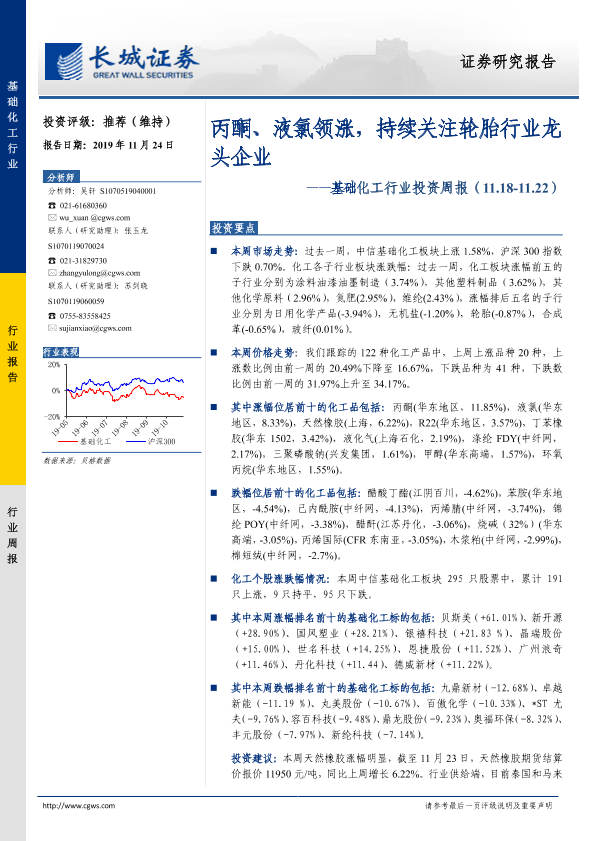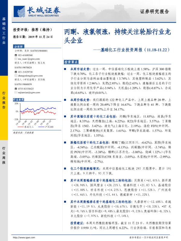 【长城证券】【20191124】20191124-长城证券-基础化工行业投资周报:丙酮、液氯领涨,持续关注轮胎行业龙头企业-26页