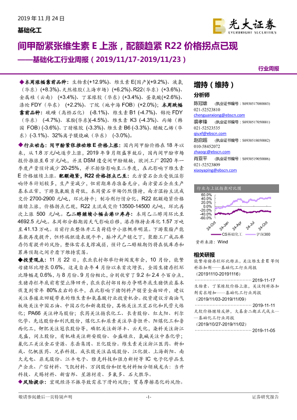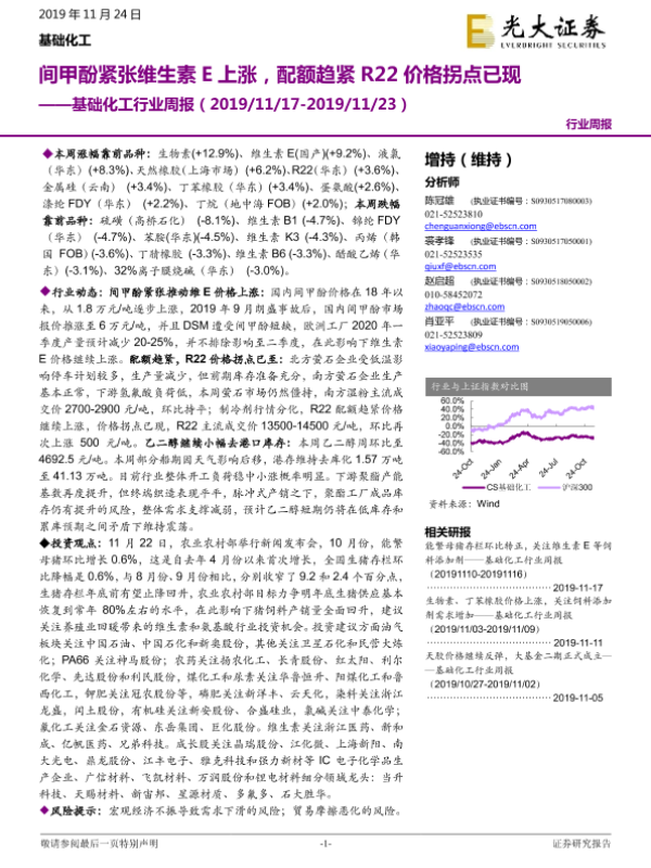 【光大证券】【20191124】基础化工行业周报:间甲酚紧张维生素E上涨,配额趋紧R22价格拐点已现-19页