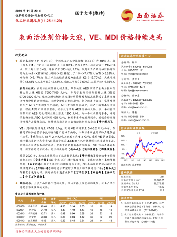 【西南证券】【20191129】20191129-西南证券-化工行业周观点:表面活性剂价格大涨,VE、MDI价格持续走高-8页