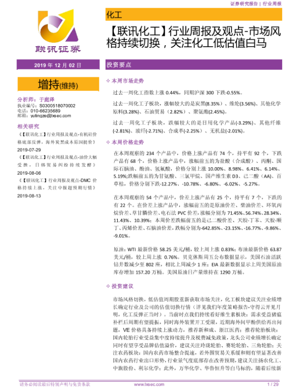价格走势 低估值白马 化工行业 市场分析 投资建议