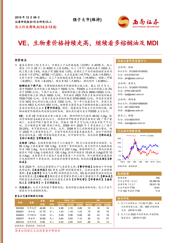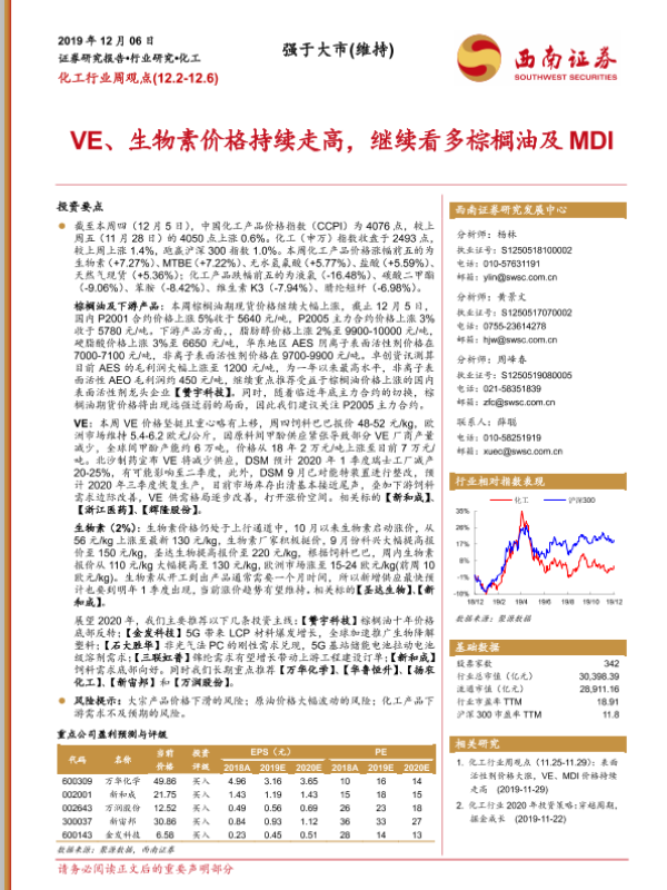 【西南证券】【20191206】20191206-西南证券-化工行业周观点:VE、生物素价格持续走高,继续看多棕榈油及MDI-8页