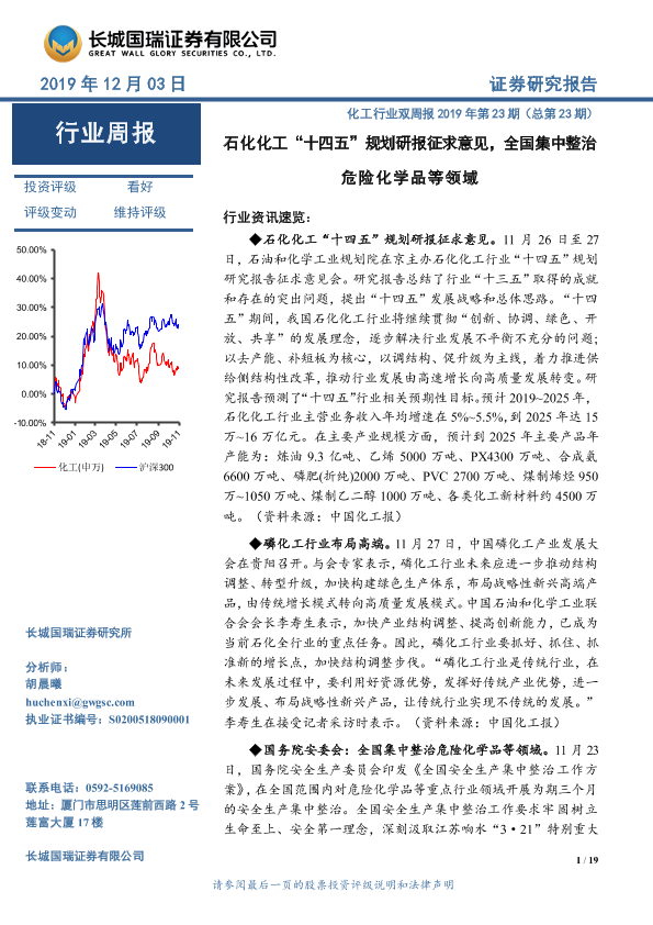 【长城国瑞证券】【20191203】化工行业双周报2019年第23期(总第23期):石化化工“十四五”规划研报征求意见,全国集中整治危险化学品等领域-19页