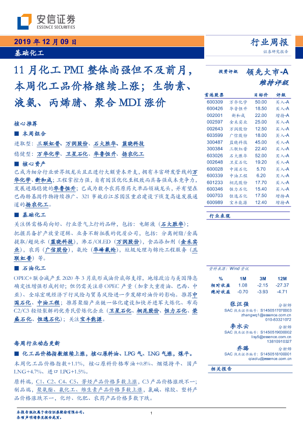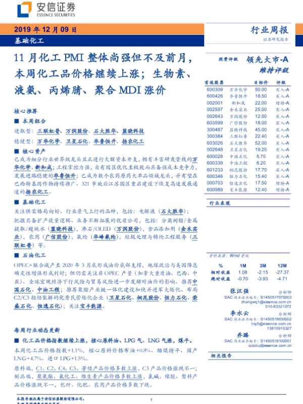 【安信证券】【20191209】20191209-安信证券-基础化工行业周报:11月化工PMI整体尚强但不及前月,本周化工品价格继续上涨;生物素、液氨、丙烯腈、聚合MDI涨价-9页